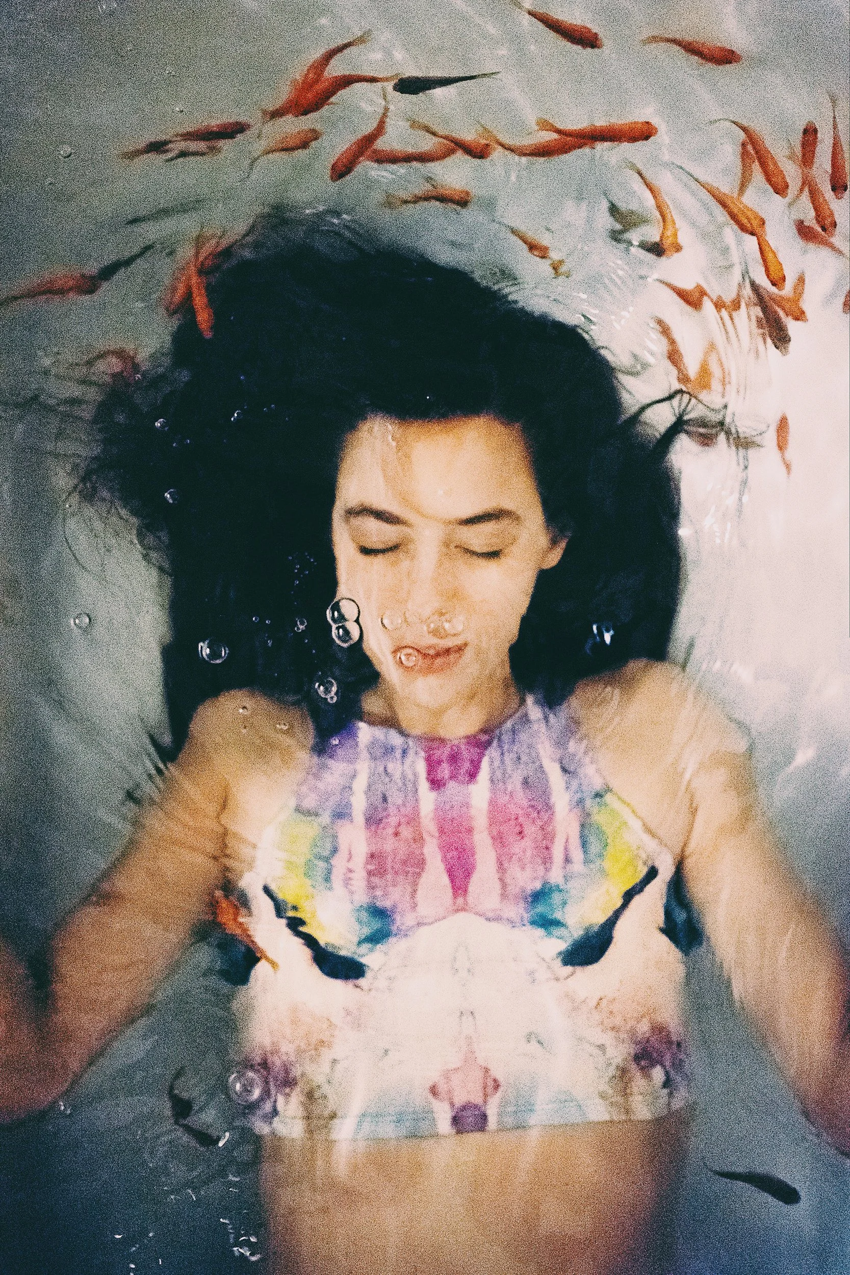 A young woman with dark hair floating in water, eyes closed, surrounded by orange and black fish.